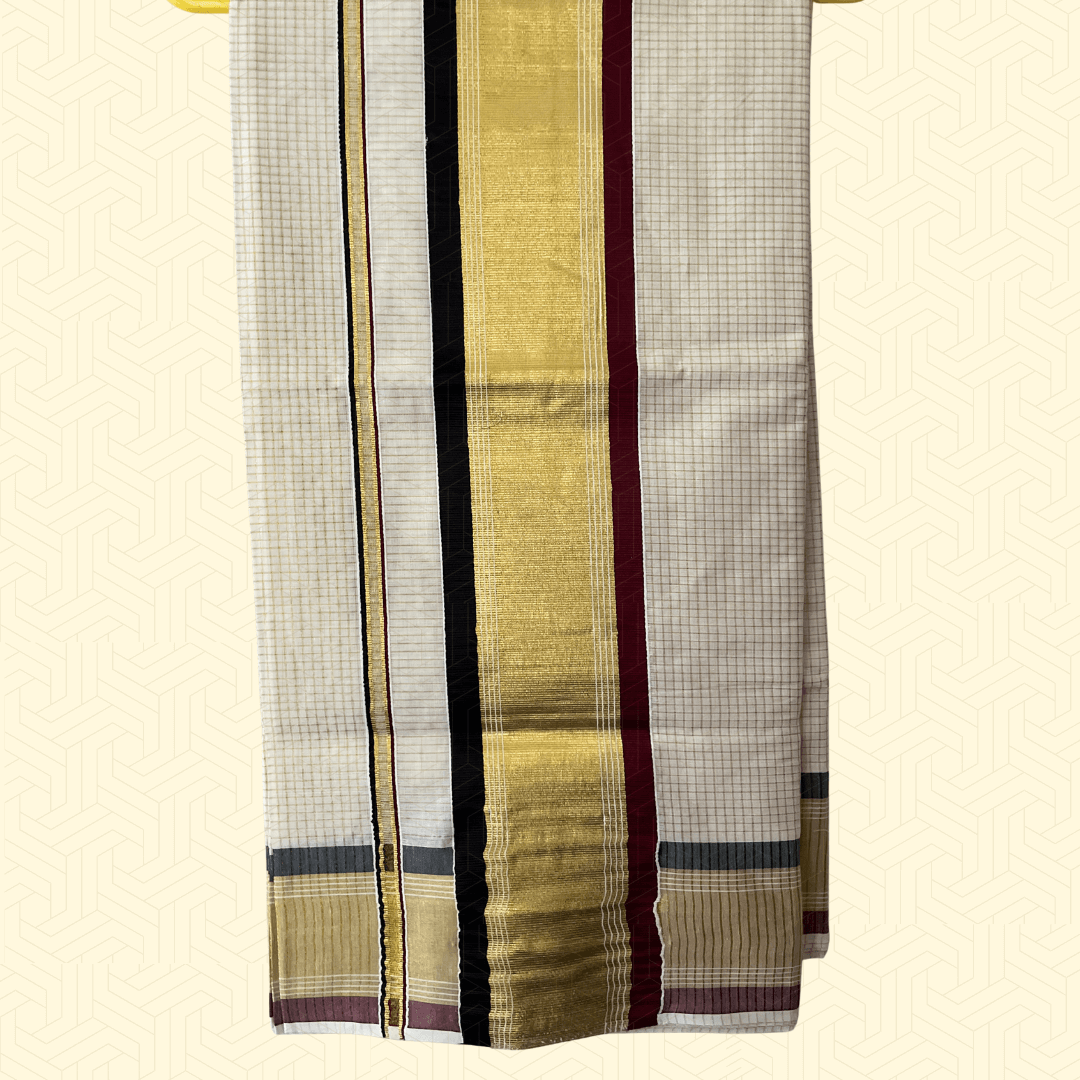 Balaramapuram Kasavu Saree – Checked Tissue Cotton with Golden Border & Maroon-Black Stripes (with Blouse Piece)