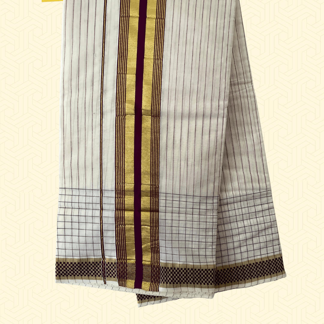 Celebrate Kerala tradition in style with this Balaramapuram Kasavu tissue cotton saree, handwoven with care by skilled artisans. The saree features a checked and striped body, highlighted by a broad golden Kasavu border with maroon accents and a woven geometric hemline pattern, giving it a distinctive festive finish. Includes a matching blouse piece.