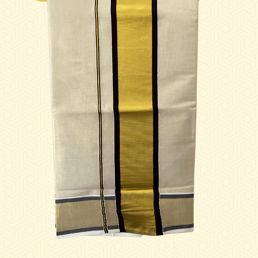 Step into timeless Kerala elegance with this authentic Balaramapuram Kasavu saree, woven in fine tissue cotton. The saree features a broad golden border framed with sleek black accents, creating a perfect balance of tradition and bold modernity. Comes with a matching blouse piece for a complete festive ensemble.