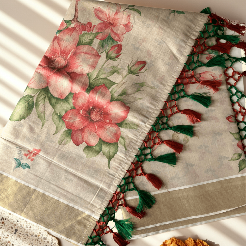 - Design: Golden Kasavu border, bold floral prints, tasseled pallu